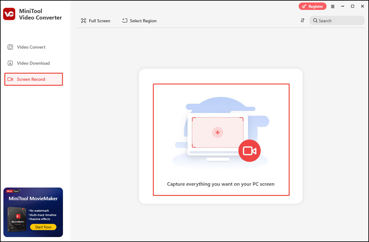 Step 2. Under the Screen Record tab, click the Capture everything you want on your PC screen area to enable the MiniTool Screen Recorder panel.